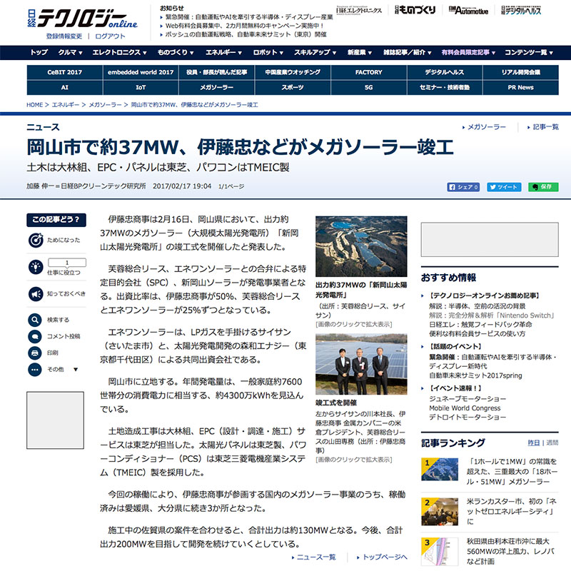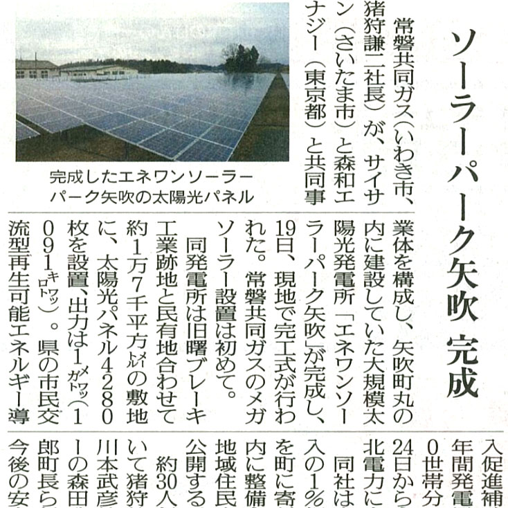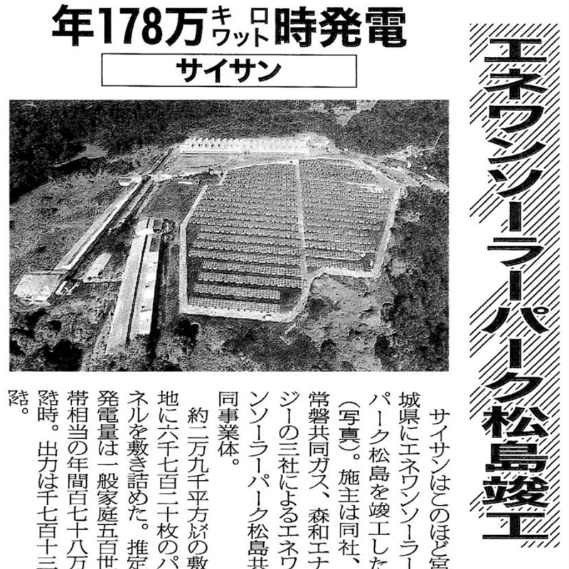再生可能エネルギー特別措置法の導入により、日本でも自然エネルギーによる発電所が増加しました。しかしながら、太陽光発電所への偏り、電力送電線の容量不足等、問題も顕在化して来ています。一方、2030年に向けた温暖化排出ガスの大幅な削減を考えると、省エネルギー、発電所の効率化や自然エネルギーの普及は、更に進めていく必要があります。当社は太陽光発電に限らず、また必ずしも自然エネルギーにも固執せず、社会のためのより良い電力供給を実現していくため、これからも一層尽くしていく所存です。